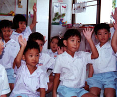 สวัสดีครับคุณครู นักเรียนชายหญิงยืนขึ้นทำความเคารพคุณครูวันเพ็ญ